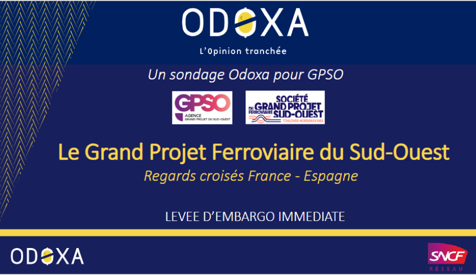 Un sondage Odoxa commandité par l’Agence GPSO (SNCF Réseau et SNCF Gares et Connexions) et la Société du GPSO publié le jeudi 4 avril révèle que la création des lignes nouvelles Toulouse – Bordeaux et Bordeaux-Dax sont massivement soutenues par les Français comme par les Espagnols.