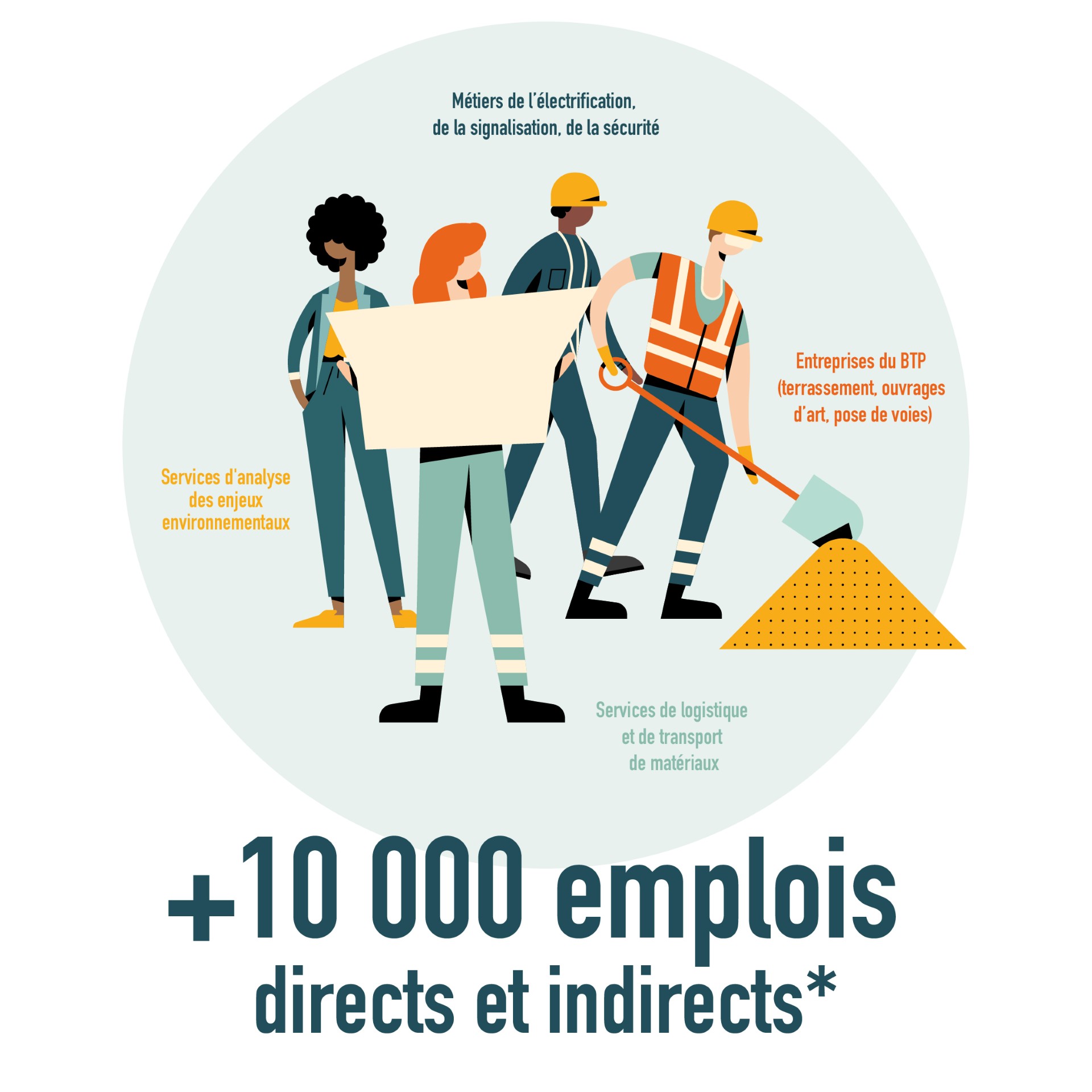 Pendant les travaux, jusqu’à 10 000 emplois directs et indirects sont créés, couvrant une diversité de métiers :
